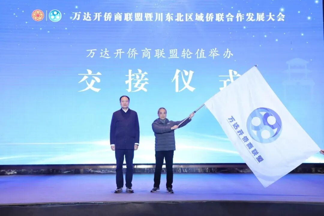会议最后,举行了“万达开侨商联盟”和川东北区域县区侨联“5+N”合作发展联盟轮值单位交旗仪式。