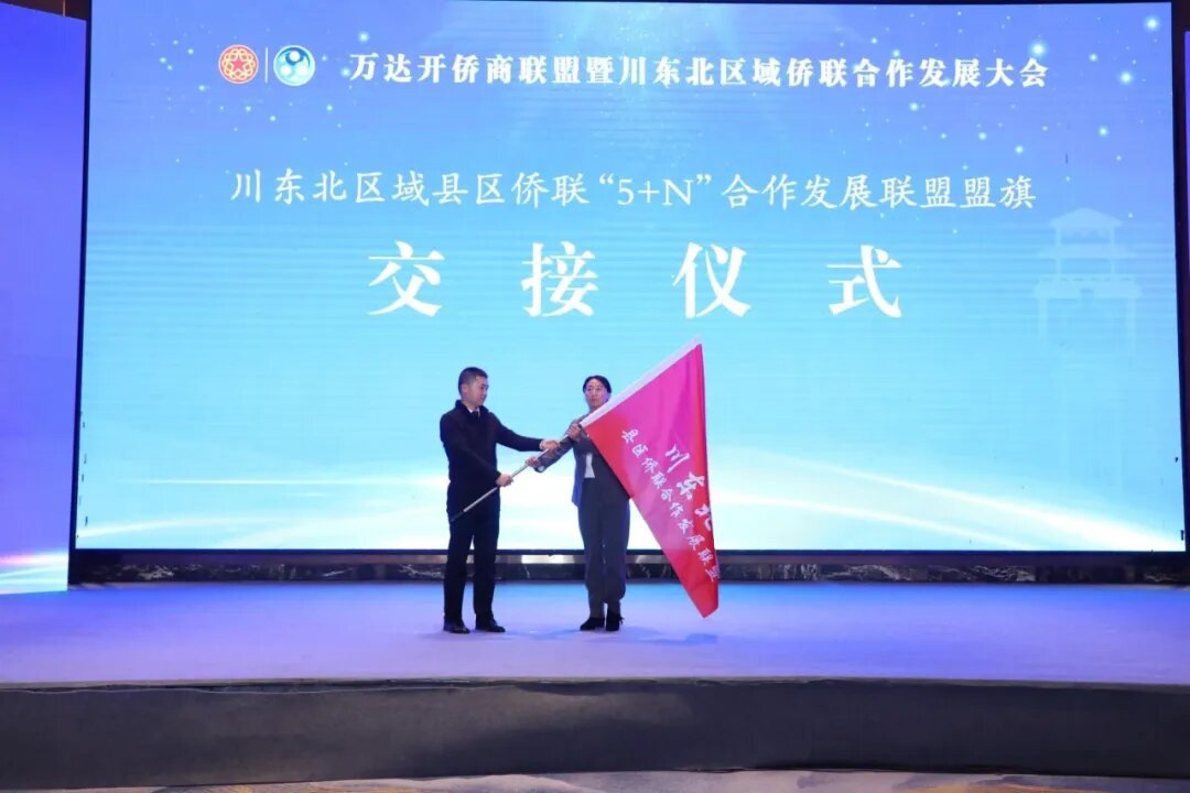 会议最后,举行了“万达开侨商联盟”和川东北区域县区侨联“5+N”合作发展联盟轮值单位交旗仪式。