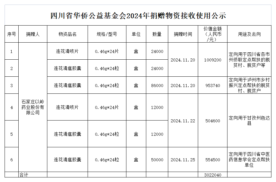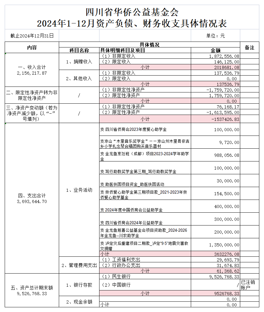 四川省华侨公益基金会2024年1-12月资产负债、财务收支具体情况表,物资接收使用公示