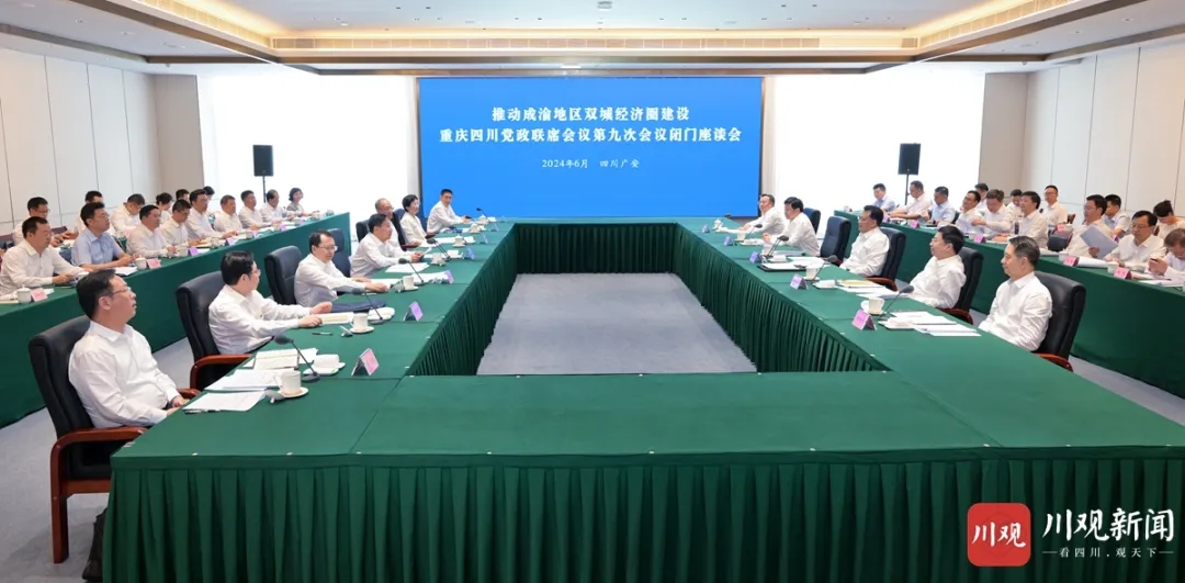 6月21日,推动成渝地区双城经济圈建设重庆四川党政联席会议第九次会议座谈会在广安市召开,深入学习贯彻习近平总书记关于推动成渝地区双城经济圈建设的系列重要指示精神和在新时代推动西部大开发座谈会上的重要讲话精神,围绕“深化改革激发创新活力、相互赋能发展新质生产力”主题,谋划川渝协同发展新任务新举措。重庆市委书记袁家军出席会议并讲话,四川省委书记、省人大常委会主任王晓晖主持会议并讲话。重庆市委副书记、市长胡衡华,四川省委副书记、省长黄强,四川省委副书记、成都市委书记施小琳分别发言。中央财办和国家发展改革委有关负责同志到会指导并讲话。